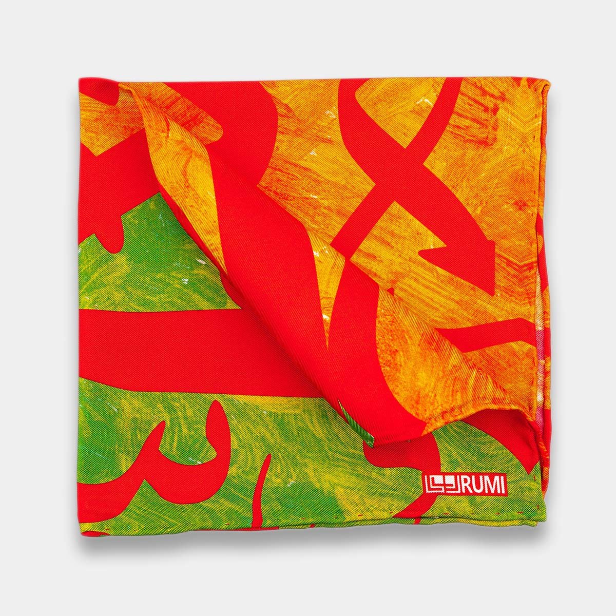 Introducing a striking silk pocket square with bold Haroof designs in red against a backdrop of mustard and green, crafted from premium silk for elegance and cultural richness. Elevate your look with captivating contrast and traditional flair, blending boldness and refinement. Suitable for formal occasions or casual affairs, this pocket square makes a statement with its unique design and timeless charm.