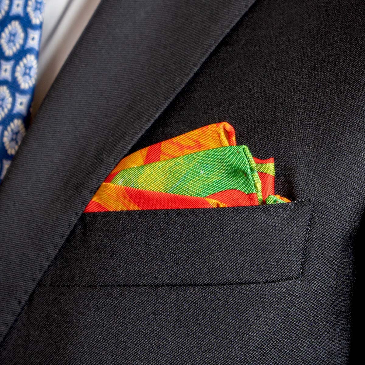 All our pocket squares feature original designs, and are printed on 100% silk, with hand hemming throughout the edges.