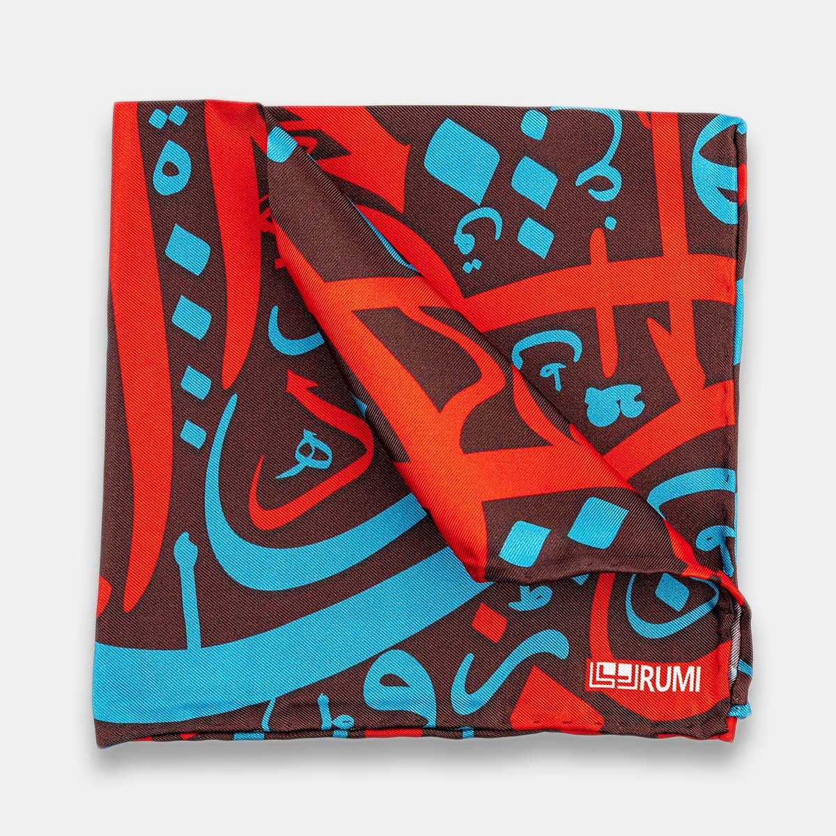 Introducing a distinguished silk pocket square with intricate Haroof designs in red and turquoise against a rich brown background, crafted from premium silk for sophistication and cultural richness. Elevate your look with captivating contrast and traditional flair, blending elegance and refinement. Suitable for formal occasions or casual affairs, this pocket square makes a statement with its unique design and timeless charm.