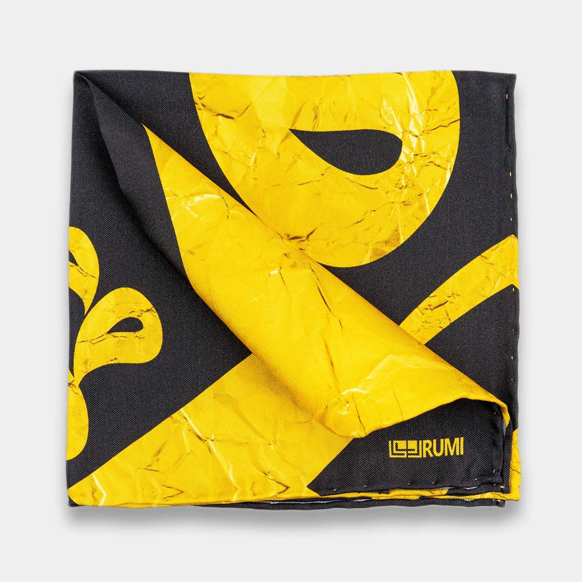 Introducing a captivating silk pocket square with vibrant yellow Haroof designs on a classic black background, crafted from premium silk for sophistication and cultural richness. Elevate your look with striking contrast and traditional flair, blending boldness and refinement. Suitable for formal occasions or casual affairs, this pocket square makes a statement with its unique design and timeless charm.