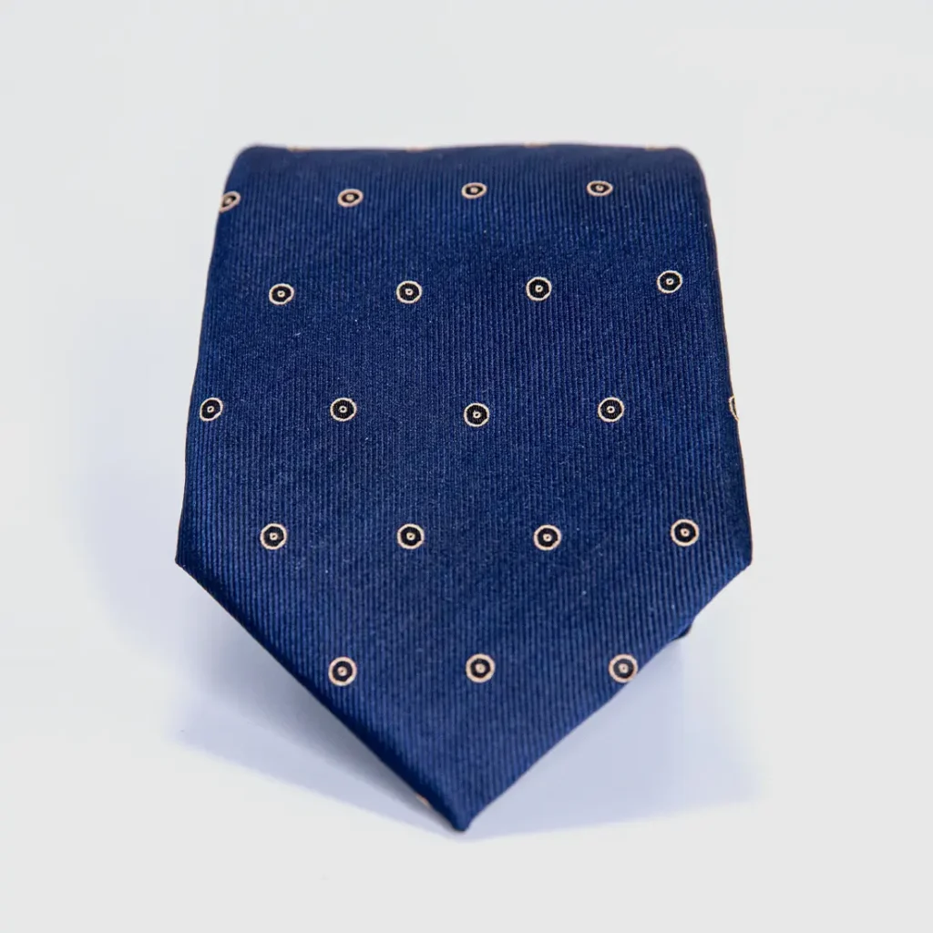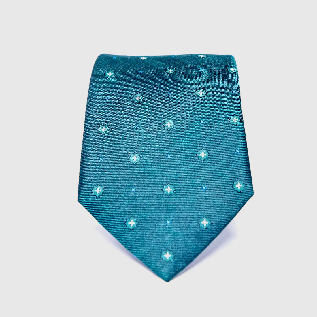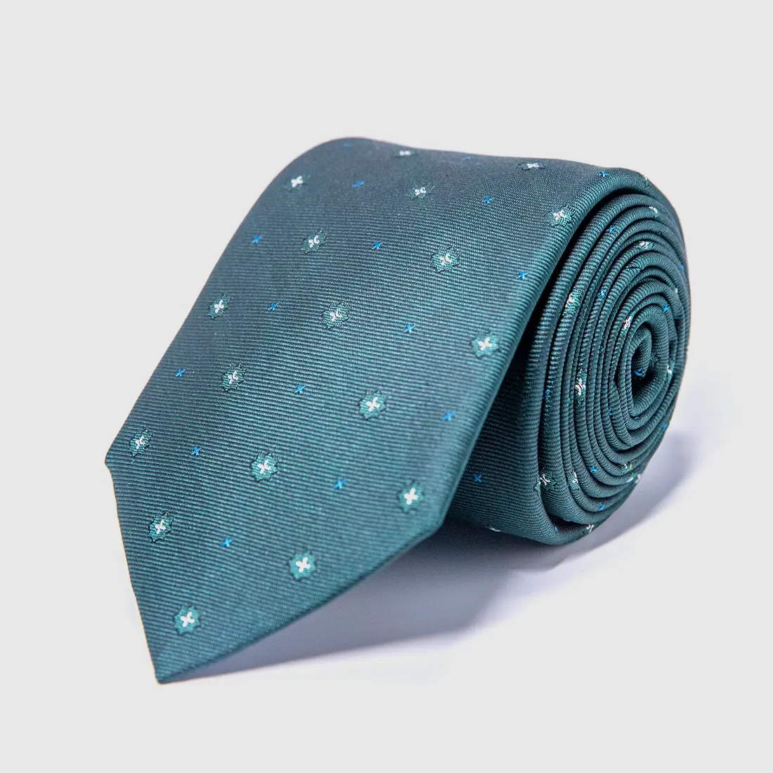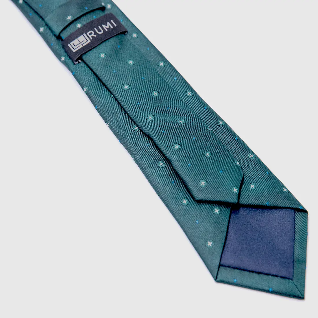 Deep forest green silk carrying two distinct motifs in conversation: a white cross-star in four-pointed bloom and a smaller bright blue accent mark between them. The result is a surface that reads as texture from across the room and as meaning up close. The four-pointed star appears in Islamic geometric tradition as a symbol of the cardinal directions, of orientation, of knowing where you stand. This tie is a quiet statement of where you come from and how far you have come.