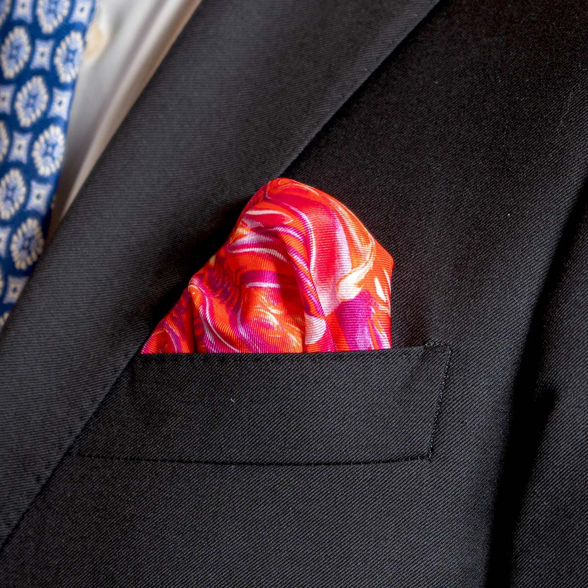 Our fiery red and orange silk pocket square is a bold and vibrant accessory crafted from luxurious silk. It adds warmth and energy to any ensemble with its striking contrast of colors. Whether paired with formal attire or a casual blazer, this pocket square exudes sophistication and personality, making a memorable impression wherever you go.