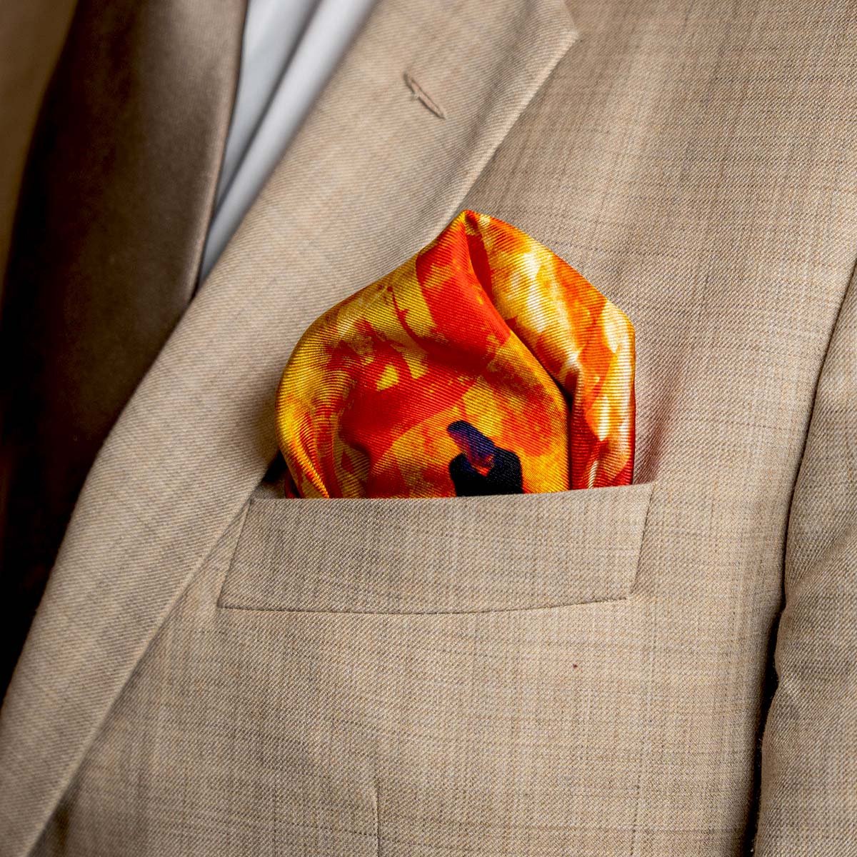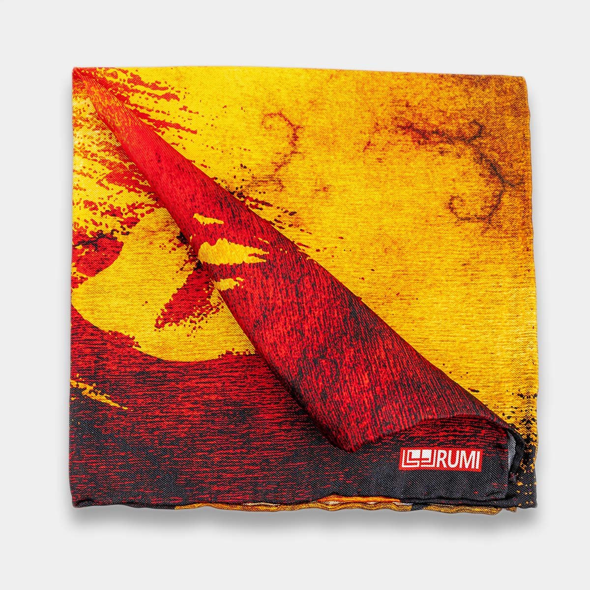 The Fire of the West pocket square captures the raw power of Divine Love with an explosion of color. This pure silk design translates abstract brushstrokes of intense red and fiery gold, instantly creating a dynamic focal point. The print makes a bold, passionate statement, connecting the wearer to the ecstatic tradition and poetic legacy of Rumi.