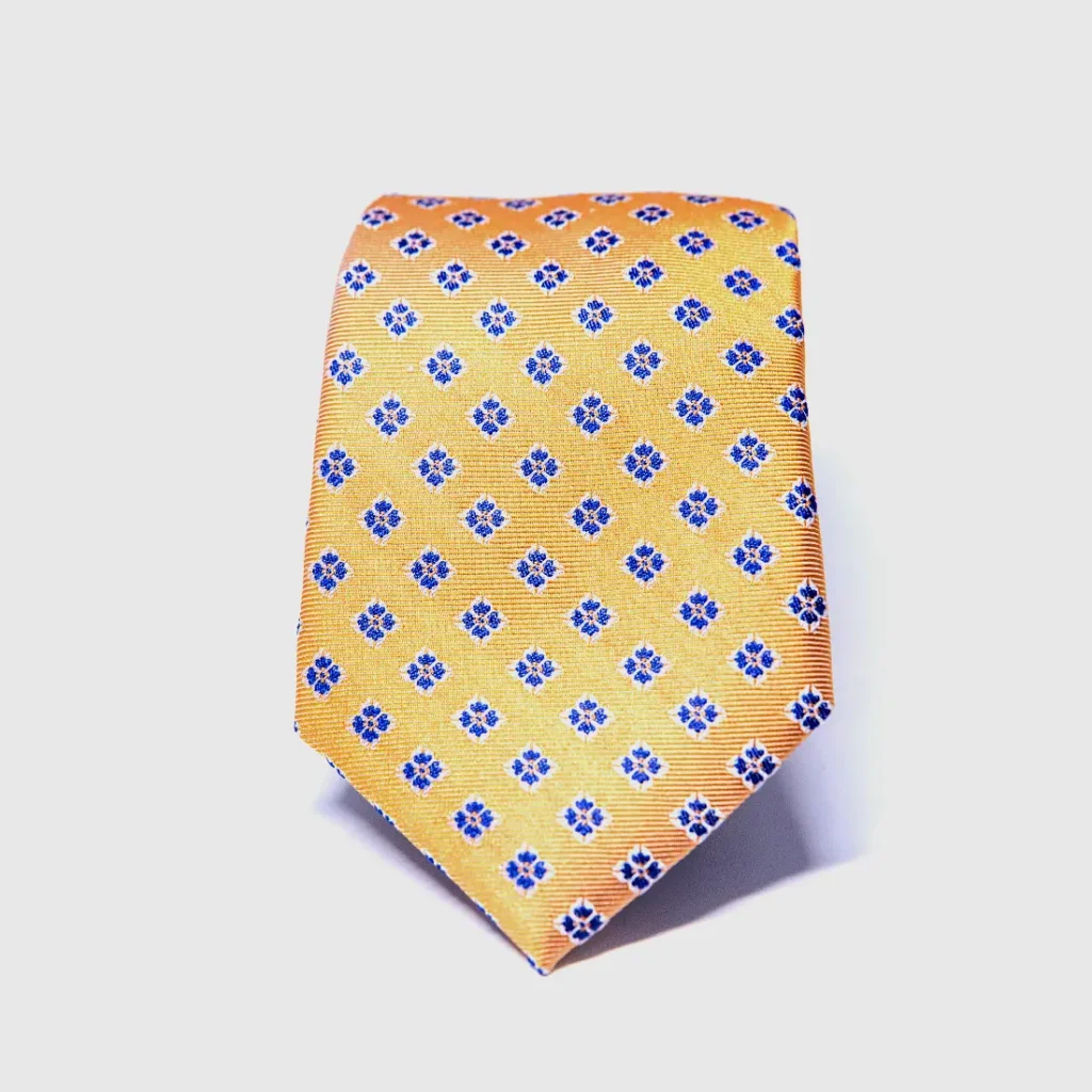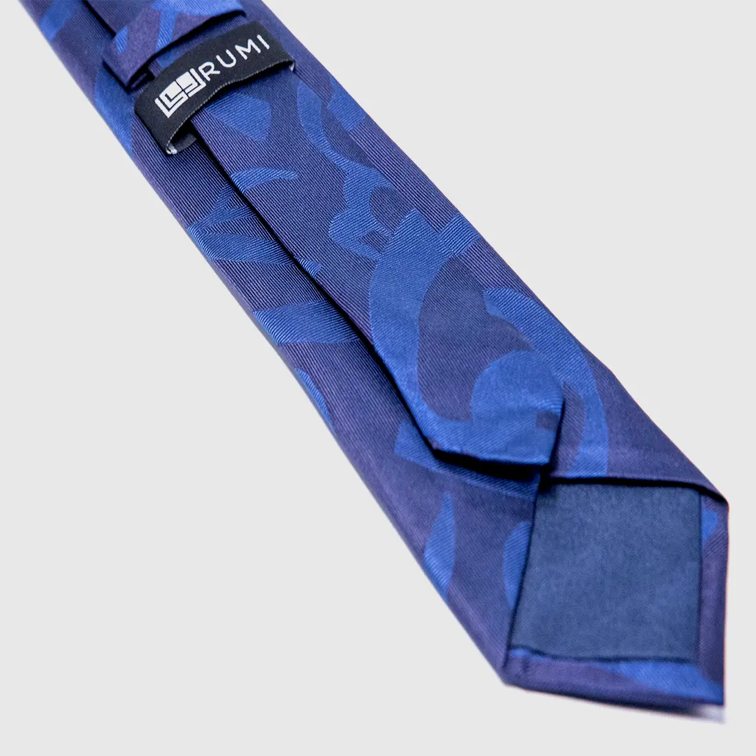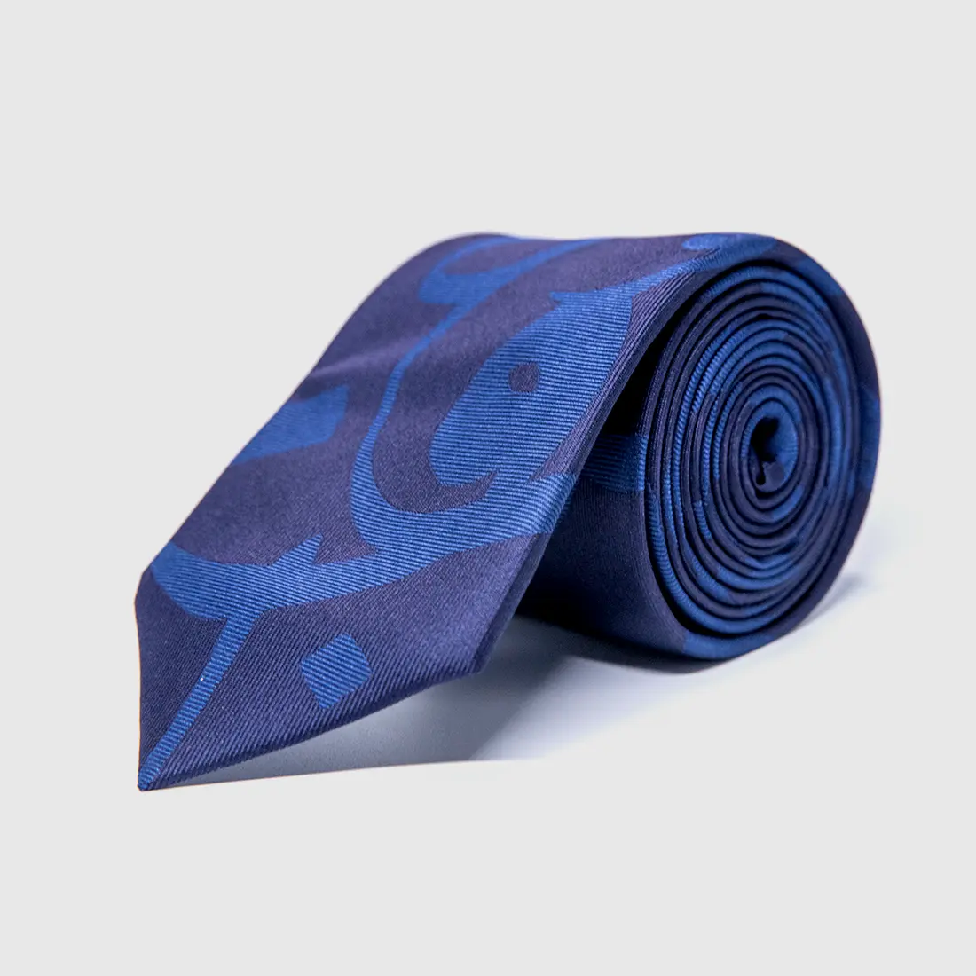 This is the most significant tie in the collection. Midnight navy silk carries large-scale Arabic calligraphy, haroof, woven directly into the face of the fabric in a tonal weave. The calligraphy does not sit on the silk. It is the silk. Two textures, the same colour, the same depth, with the letter and the ground indistinguishable until the light finds the difference between them. Arabic script in the Sufi tradition is never merely decorative. It is the word as sacred form. This tie is worn with the understanding that what rests against your chest carries weight.