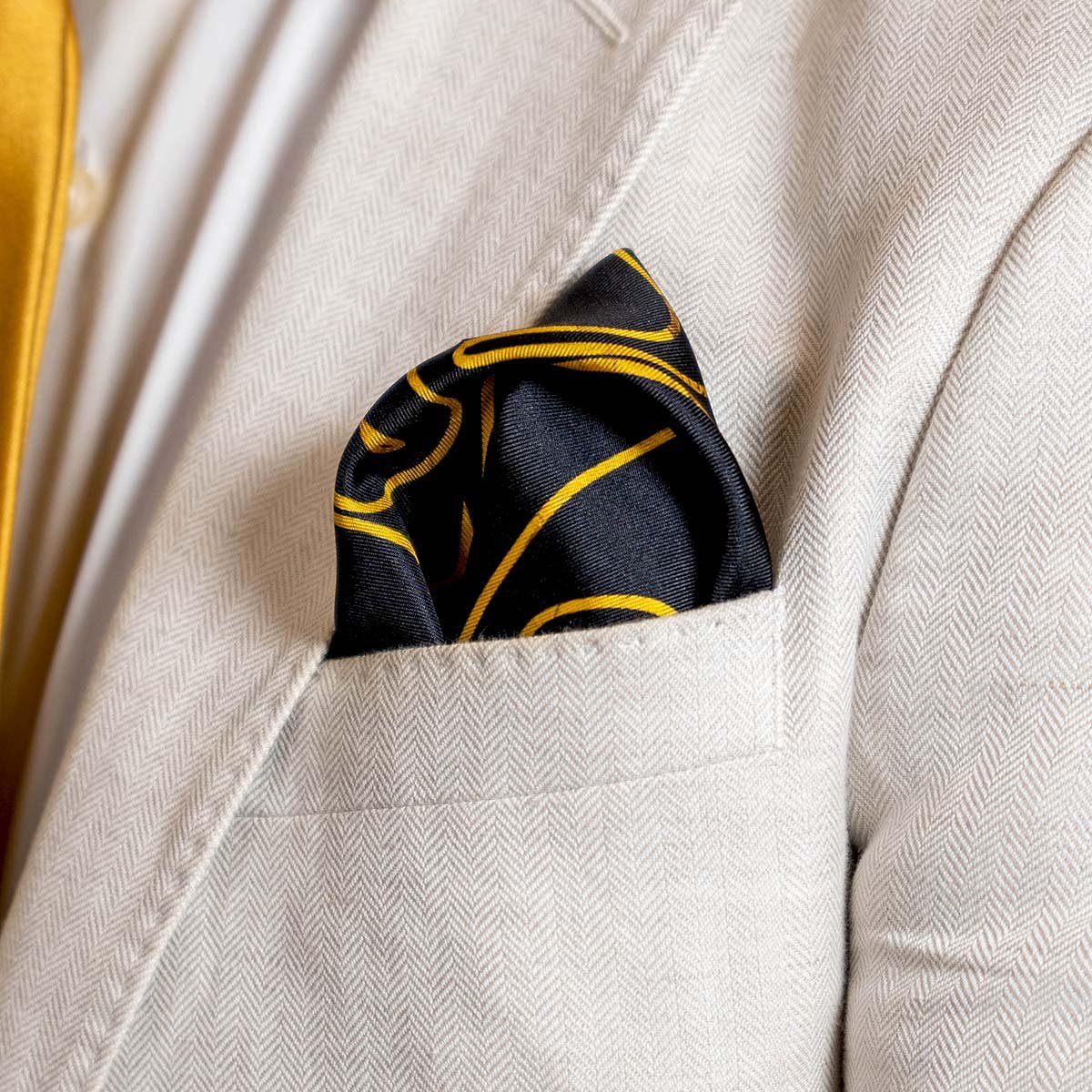 All our pocket squares feature original designs, and are printed on 100% silk, with hand hemming throughout the edges.