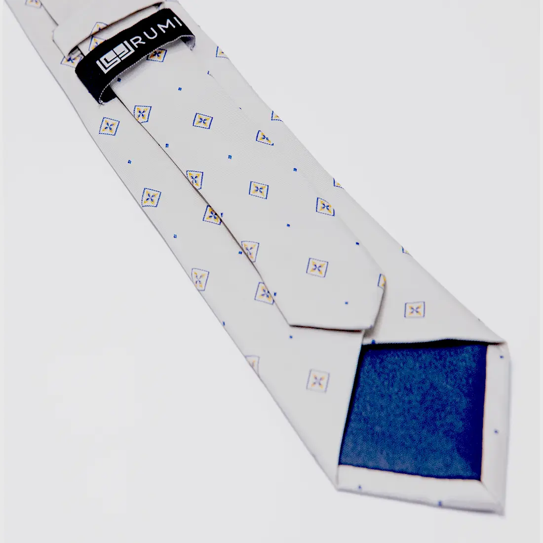 Ivory silk carries the quietest luxury. The ground is soft and warm, with a faint sheen that reads as cream in shadow and white in light. Across it, a pattern of blue diamond-framed compass stars, each containing a four-pointed gold motif, with small blue dots placed between them like punctuation. The compass star is a symbol of navigation and of purpose moving in a clear direction. This is the most formal of the collection, suited for the man who wears white to an occasion and lets the detail speak for everything else.