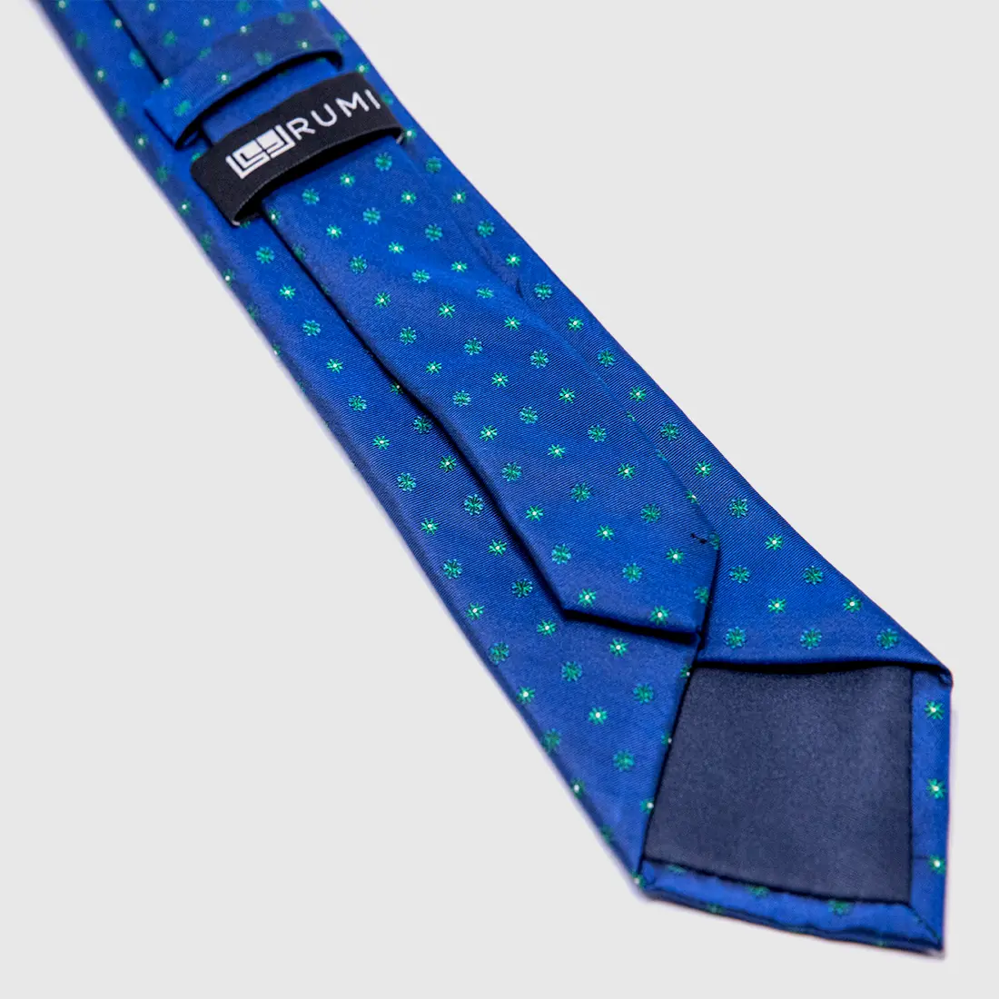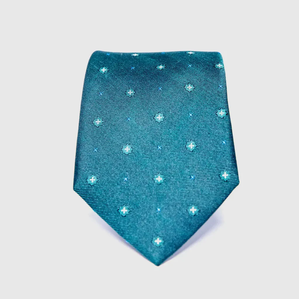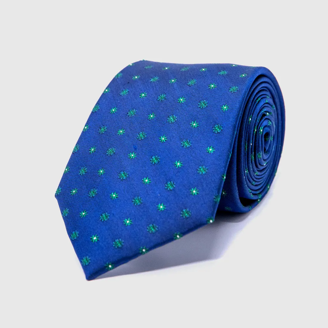 A lapis blue ground, cool and composed, carrying a scatter of emerald green 8-point star motifs, each one small, exact, crystalline in its weave. The 8-point star appears here in a single colour against the blue, creating a surface of quiet geometric rhythm. Lapis lazuli, the stone, was ground into pigment for the illuminated manuscripts of the Islamic world, representing the blue of divine knowledge and of the sky at the moment before it becomes night. This tie carries that blue and seeds it with green, the colour of life and continuity. It is a scholarly tie, for a man who reads.