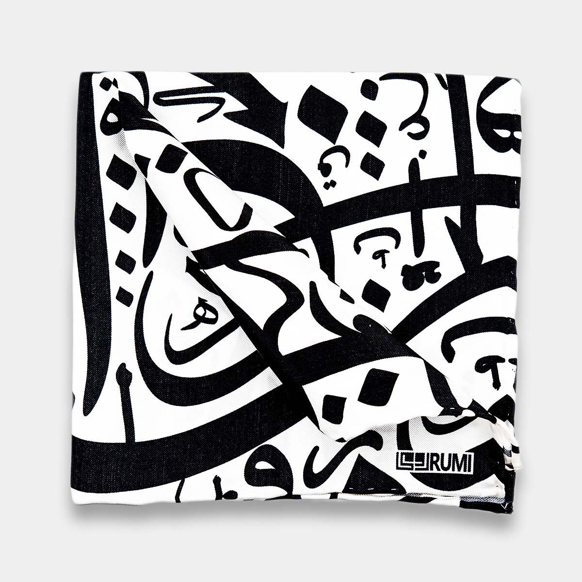 Introducing a sophisticated silk pocket square with bold black Haroof designs on a crisp white backdrop, crafted from premium silk for elegance and cultural richness. Elevate your look with striking contrast and traditional flair, blending boldness and refinement. Suitable for formal occasions or casual affairs, this pocket square makes a statement with its unique design and timeless charm.