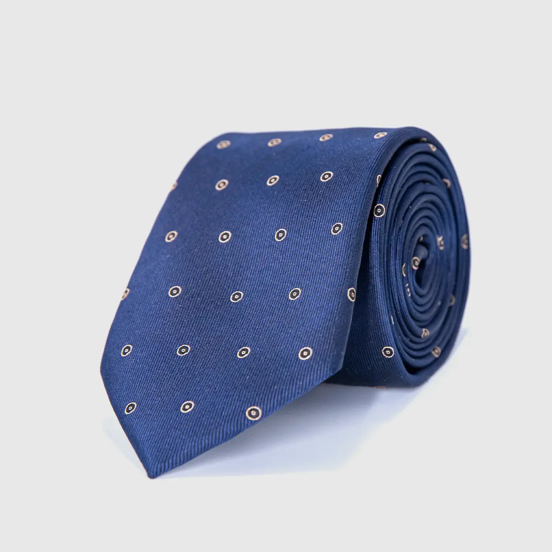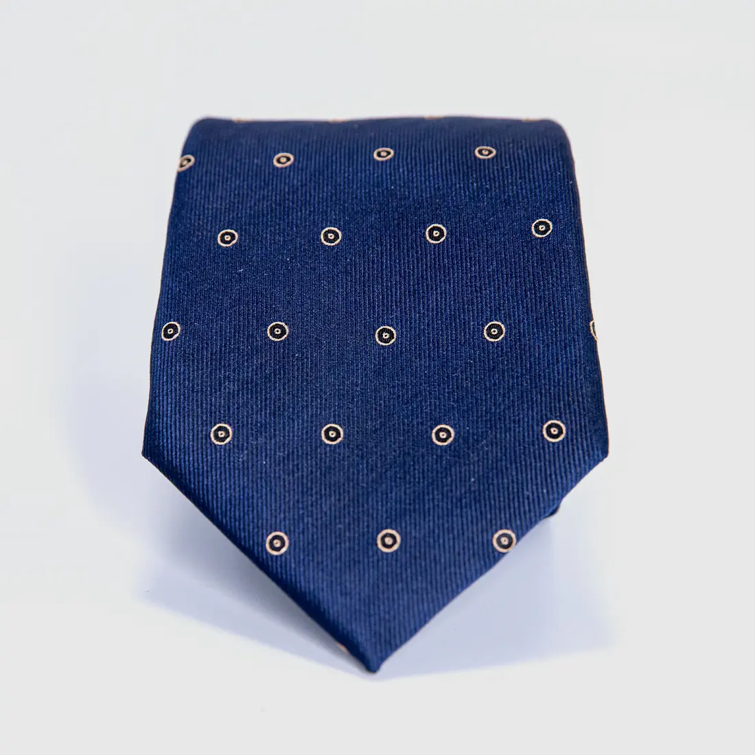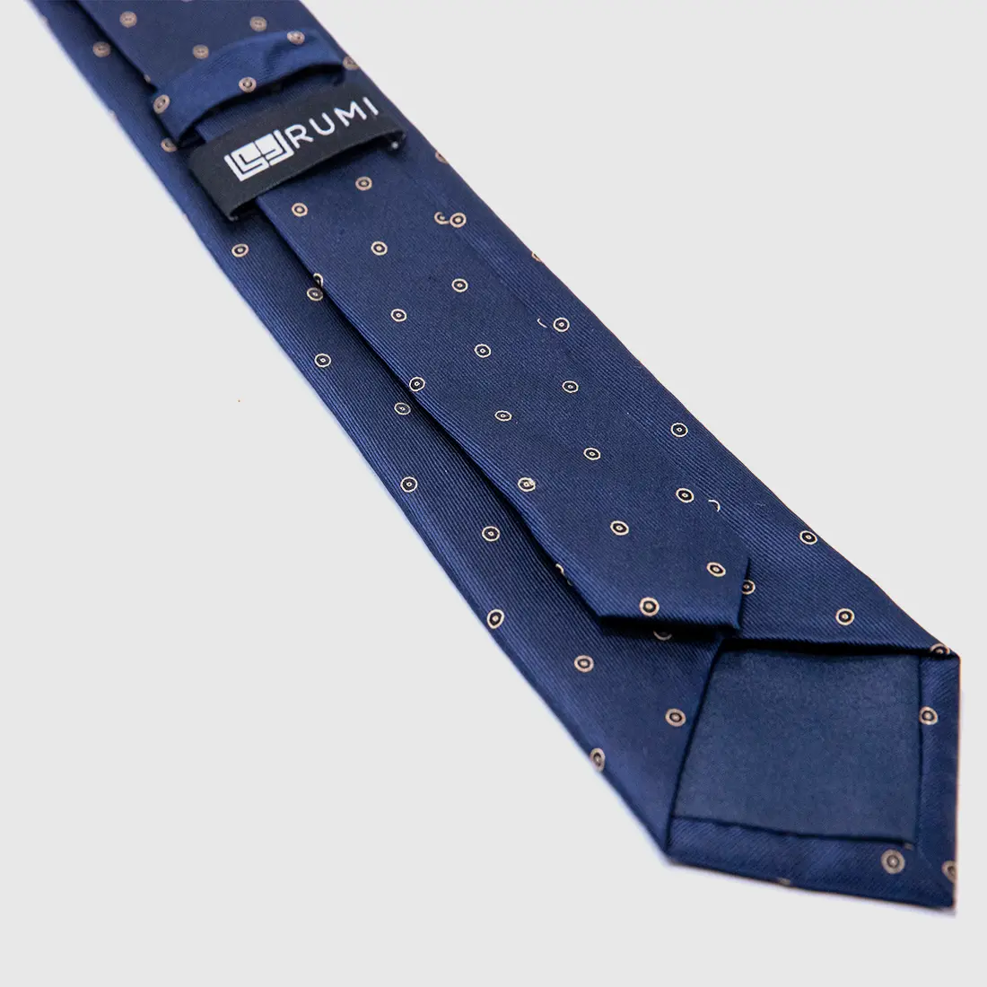 A deep royal navy ground carries scattered gilt circle medallions, concentric rings woven in warm gold against the cool of the silk. The circle, in Sufi tradition, is the shape of the soul returning to its origin. Here it appears quietly, scattered like coins of light across an evening sky. The silk is smooth and the navy deep enough to absorb the room around you. Pair with a charcoal or navy suit.