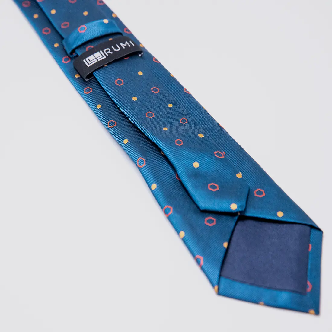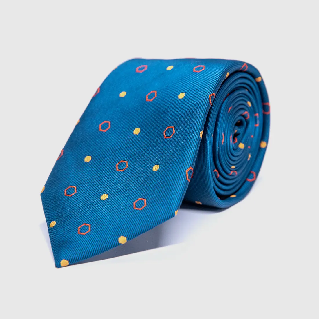 Woven in deep teal silk, this tie carries a pattern of red hexagon outlines and saffron gold dots drawn from the mathematical harmony of Islamic architecture. The hexagon, a symbol of structural perfection, repeats across the face of the tie in a rhythm that is both restrained and deeply intentional. The ribbed silk catches light differently at every angle, revealing the texture beneath the pattern. Wear it with a white or ivory shirt when the occasion demands more than presence.