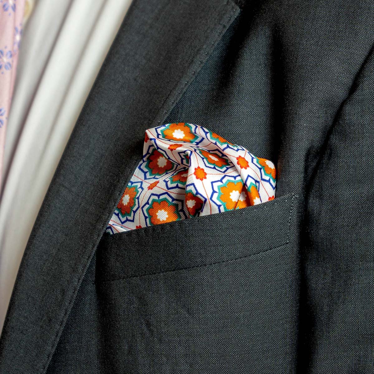 All our pocket squares feature original designs, and are printed on 100% silk, with hand hemming throughout the edges.